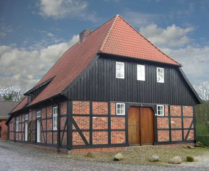mit gemeinsamem Schornstein und aneinanderliegenden Feuerstellen.Der Anbau am Ostgiebel dürfte